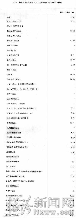 2013年,规模以上工业企业法人单位总资产贡献率为6.50%,比2008年下降8.84个百分点。主营业务收入利润率为1.38%,比2008年下降1.97个百分点。其中,采矿业为4.89%,比2008年下降9.53个百分点;制造业为-0.68%,比2008年上升0.39个百分点;电力、热力、燃气及水生产和供应业为4.71%,比2008年上升26.56个百分点。详见表2-4)。