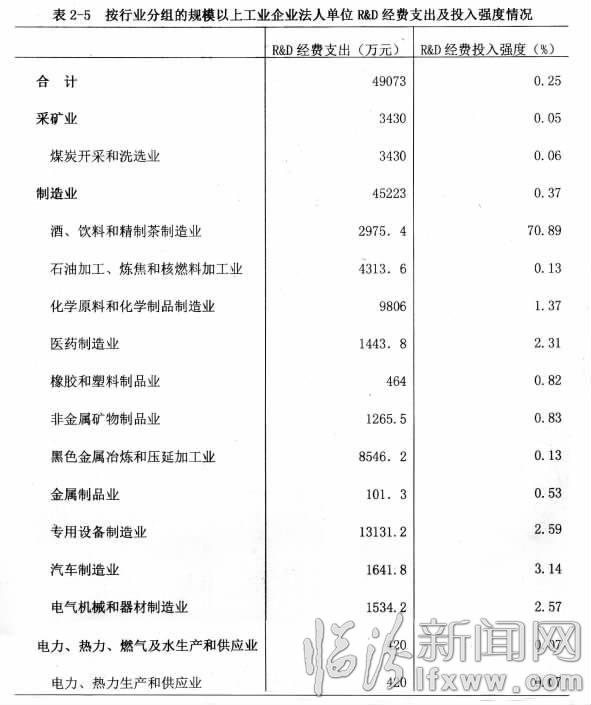 2013年,规模以上工业企业法人单位R&D经费支出4.91亿元,比2008年增长76.62%;R&D经费投入强度为0.25%,比2008年提高0.04个百分点。规模以上工业企业法人单位分行业R&D经费支出及投入强度情况详见表2-5。