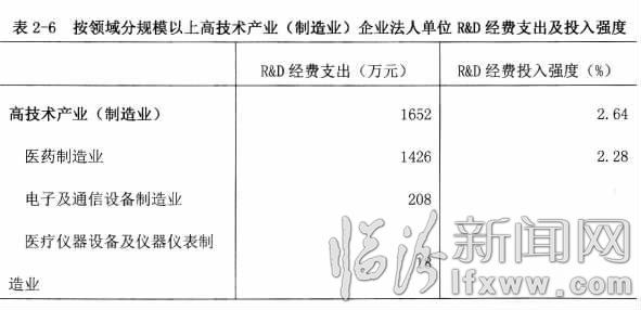 2013年,规模以上高技术产业(制造业)企业法人单位R&D经费支出1652万元,占规模以上制造业的比重为3.65%(详见表2-6)。