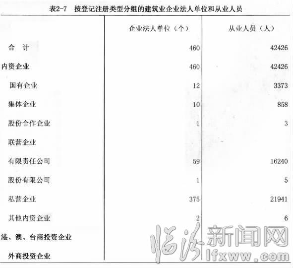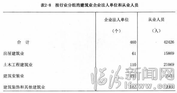 (一)企业法人单位数和从业人员 2013年末,全市共有建筑业企业法人单位460个,比2008年末增长26%;从业人员42426人,比2008年末下降25%。