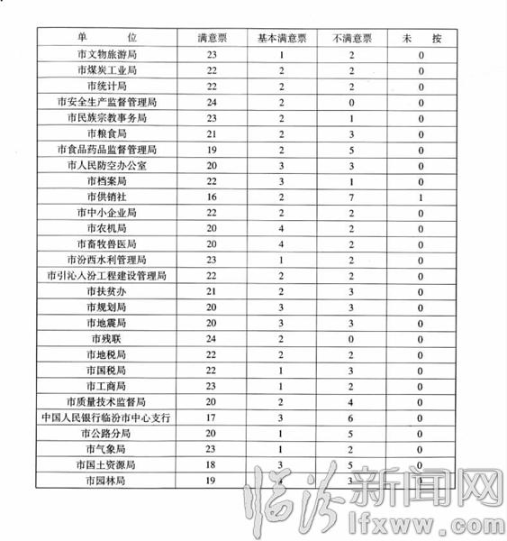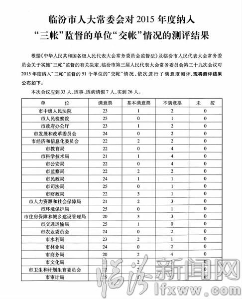根据《中华人民共和国各级人民代表大会常务委员会监督法》及临汾市人民代表大会常务委员会关于实施“三账”监督的有关决定,临汾市第三届人民代表大会常务委员会第三十九次会议对2015年度纳入“三账”监督的51个单位的“交账”情况,依次进行了满意度测评,现将测评结果公布如下: