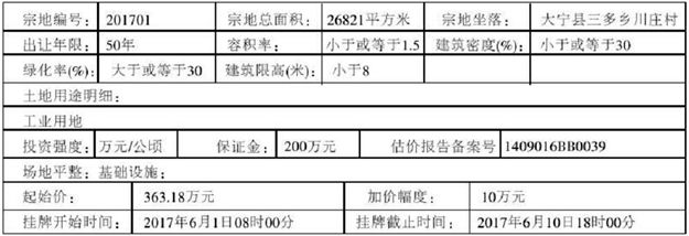 六、本次国有土地使用权挂牌活动在大宁县国土资源局进行。各地块挂牌时间分别为: