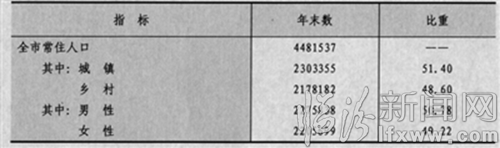 据2017年人口抽样调查,年末全市常住人口448.15万人,比上年末增加2.35万人。全年全市出生人口4.77万人,人口出生率为10.68‰;死亡人口2.42万人,死亡率为5.42‰;自然增长率为5.26‰。人口性别比为103.18。