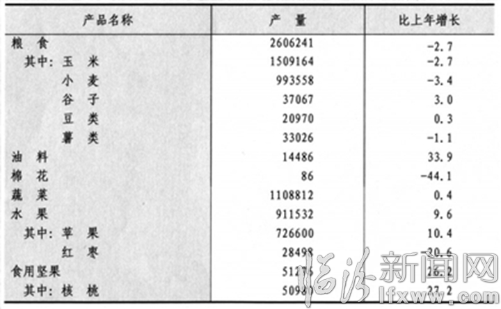 全年全市粮食产量260.6万吨,比上年减产2.7%。其中,夏粮99.4万吨,减产3.4%;秋粮161.3万吨,减产2.3%。