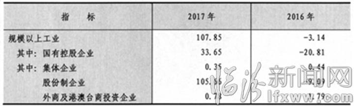 发展质量效益明显提高。2017年,全市一般公共预算收入97.1亿元,比上年增长12.9%。其中,税收收入71.8亿元,增长43.0%,占一般公共预算收入的比重达到74.0%,比上年同期提高15.6个百分点。2017年,全市规模以上工业企业实现主营业务收入1545.8亿元,增长23.4%;实现利润107.9亿元,增加111亿元,为2011年以来最好水平。全市工业企业主营业务收入利润率达到7%,提高7.2个百分点。