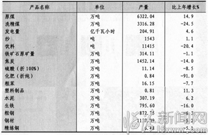 全年全市规模以上工业企业原煤产量6322.0万吨,增长14.9%;发电量204.9亿千瓦时,增长4.6%;焦炭产量1452.1万吨,下降14.0%;钢材产量1138.0万吨,下降5.2%。