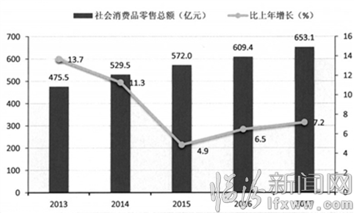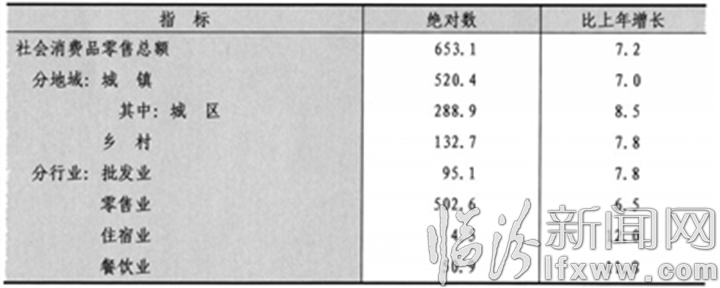 全年全市社会消费品零售总额653.1亿元,增长7.2%。按经营地统计,城镇消费品零售额520.4亿元,增长7.0%;乡村消费品零售额132.7亿元,增长7.8%。按消费形态统计,商品零售额597.7亿元,增长6.8%;餐饮收入额55.4亿元,增长11.8%。
