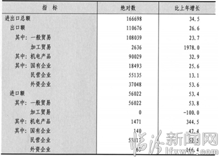 全年全市海关进出口总额16.67亿元,增长34.5%。其中,进口额5.60亿元,增长53.4%;出口额11.07亿元,增长26.6%。