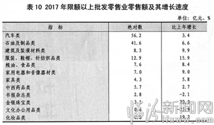 表10 2017年限额以上批发零售业零售额及其增长速度