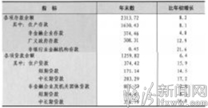 年末全市金融机构本外币各项存款余额2313.72亿元,比年初增加174.71亿元,比年初增长8.2%。各项贷款余额1259.82亿元,比年初增加75.66亿元,比年初增长6.4%。