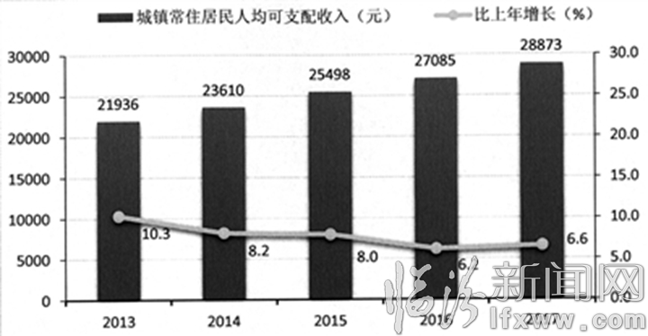 图12 2013-2017年城镇常住居民人均可支配收入及其增长速度