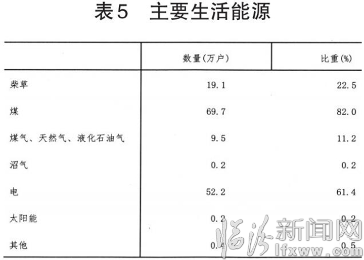 农民做饭取暖使用的能源中,主要使用煤的69.7万户,占82.0%;主要使用电的52.2万户,占61.4%;主要使用柴草的19.1万户,占22.5%;主要使用煤气、天然气、液化石油气的9.5万户,占11.2%;主要使用沼气的0.2万户,占0.2%;主要使用太阳能的0.2万户,占0.2%;使用其他能源的0.4万户,占0.5%。