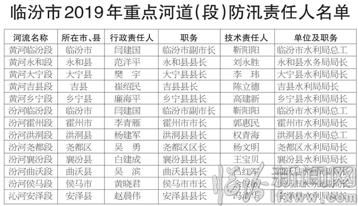 根据《中华人民共和国防洪法》《中华人民共和国抗旱条例》和国家防总关于《各级地方人民政府行政首长防汛抗旱工作职责》的规定,结合我市实际情况,为全面做好2019年防汛抗旱工作,确保安全度汛,现将市、县两级防汛抗旱责任人、全市中型水库、重点河道(段)、重点防洪城市和县城防汛责任人予以公示。