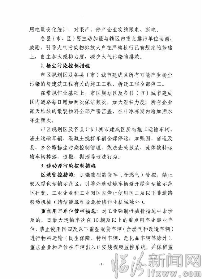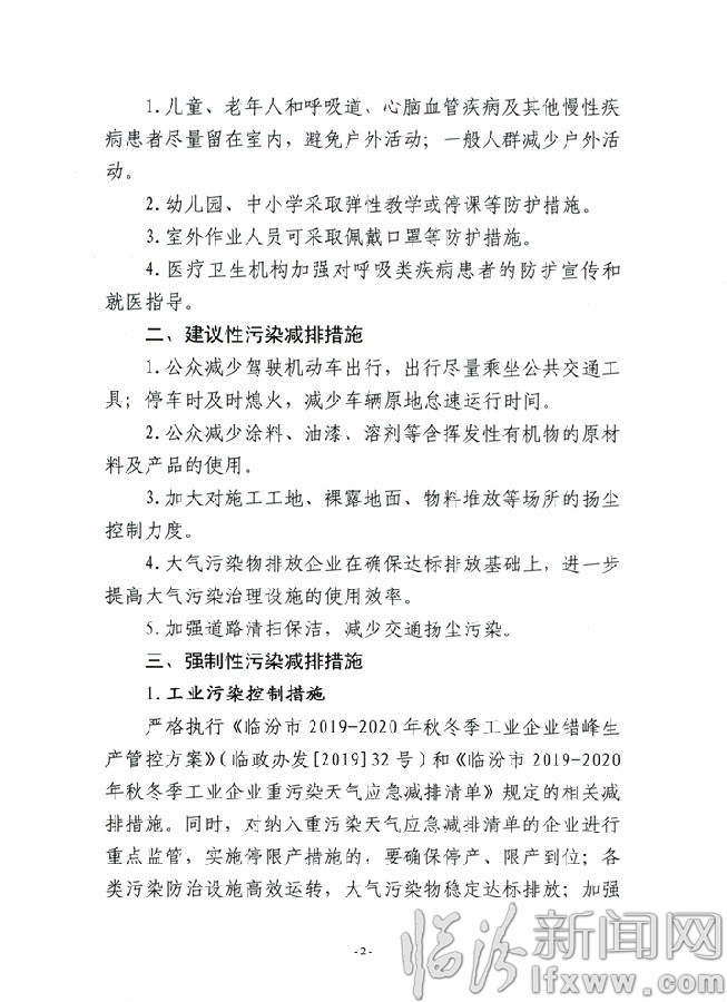 严格执行《临汾市2019-2020年秋冬季工业企业错峰生产管控方案》(临政办发[2019]32号)和《临汾市2019-2020年秋冬季工业企业重污染天气应急减排清单》规定的相关减排措施。同时,对纳入重污染天气应急减排清单的企业进行重点监管,实施停限产措施的,要确保停产、限产到位;各类污染防治设施高效运转,大气污染物稳定达标排放;加强用电量变化统计,对限产、停产企业实施限电、断电。