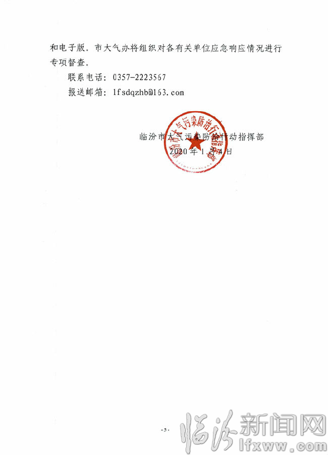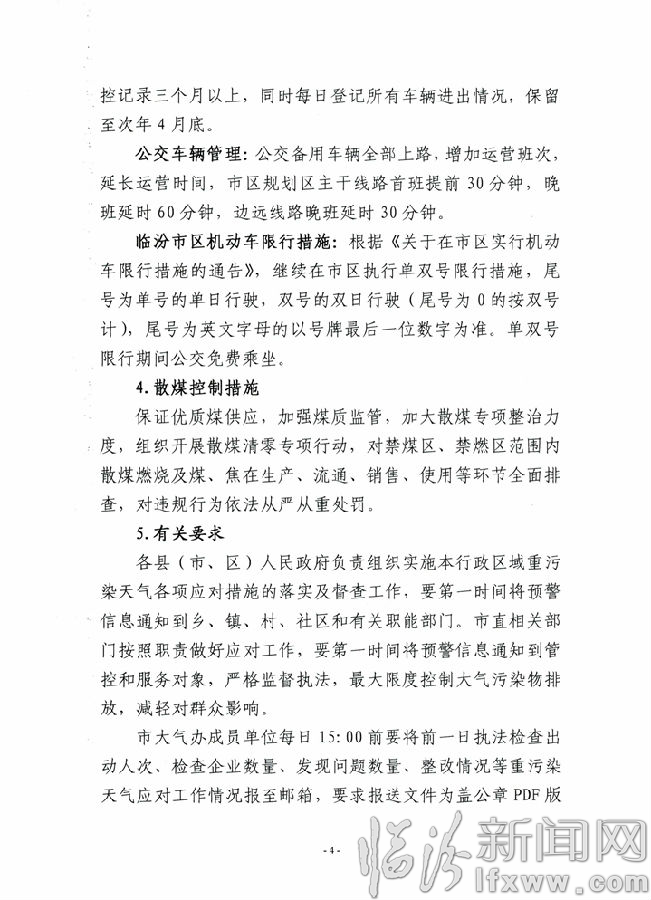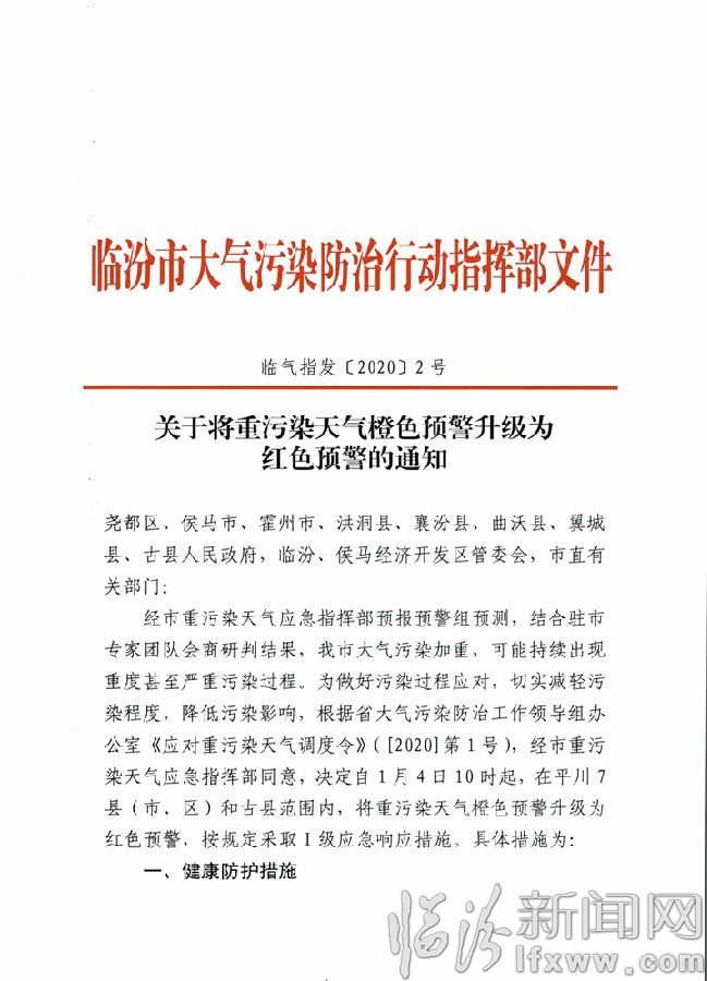 经市重污染天气应急指挥部预报预警组预测,结合驻市专家团队会商研判结果,我市大气污染加重,可能持续出现重度甚至严重污染过程。为做好污染过程应对,切实减轻污染程度,降低污染影响,根据省大气污染防治工作领导组办公室《应对重污染天气调度令》([2020]第1号),经市重污染天气应急指挥部同意,决定自1月4日10时起,在平川7县(市、区)和古县范围内,将重污染天气橙色预警升级为红色预警,按规定采取Ⅰ级应急响应措施。具体措施为: