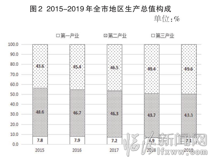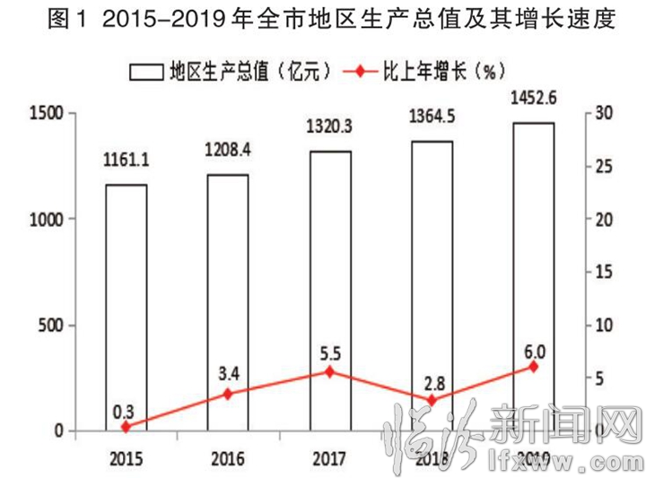 初步核算,全年全市地区生产总值1452.6亿元,比上年增长6.0%。其中,第一产业增加值103.5亿元,增长2.5%,占生产总值的比重为7.1%;第二产业增加值628.4亿元,增长4.7%,占生产总值的比重为43.3%;第三产业增加值720.7亿元,增长7.6%,占生产总值的比重为49.6%。第三产业中,金融业增加值78.1亿元,增长8.5%;房地产业增加值102.7亿元,增长10.4%;批发和零售业增加值109.4亿元,增长2.6%;交通运输、仓储和邮政业增加值83.7亿元,增长5.7%。