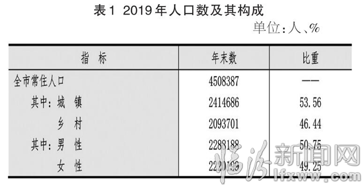 据2019年人口抽样调查,年末全市常住人口450.84万人,比上年末增加0.81万人。全年全市出生人口3.86万人,人口出生率为8.56‰;死亡人口2.57万人,死亡率为5.71‰;自然增长率为2.85‰。人口性别比为103.06。