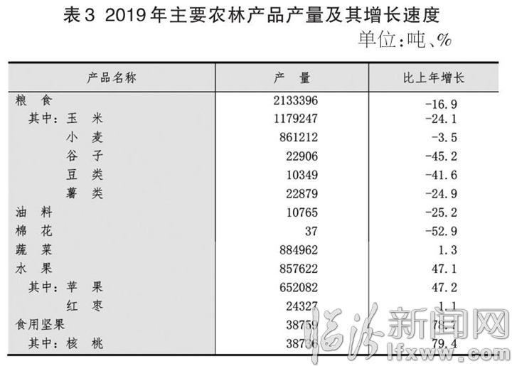 全年全市农作物种植面积526.26千公顷,比上年减少7.62千公顷,下降1.43%。其中,粮食种植面积492.72千公顷,减少5.98千公顷;油料种植面积6.34千公顷,减少1.30千公顷;蔬菜种植面积16.69千公顷,减少0.35千公顷。在粮食种植面积中,玉米种植面积256.98千公顷,减少2.23千公顷;小麦种植面积191.08千公顷,减少7.79千公顷。果园种植面积58.53千公顷,增加6.76千公顷。