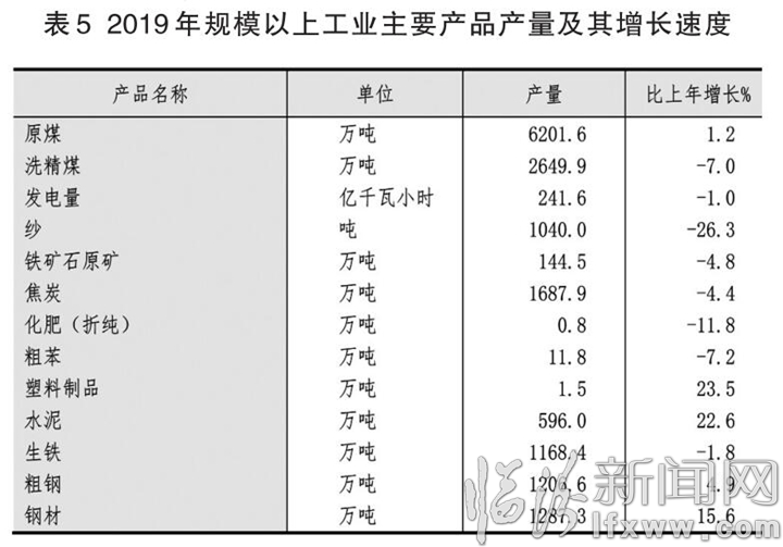 全年全市规模以上工业企业原煤产量6201.6万吨,增长1.2%;发电量241.6亿千瓦时,下降1.0%;焦炭产量1687.9万吨,下降4.4%;钢材产量1287.3万吨,增长15.6%。