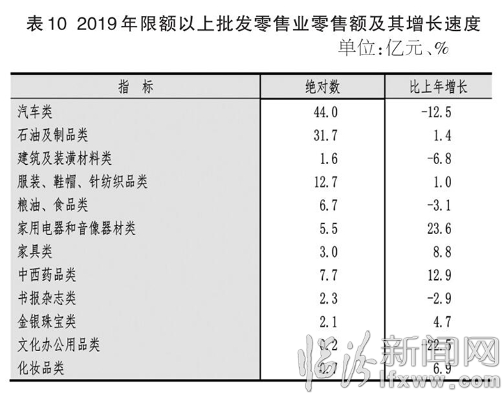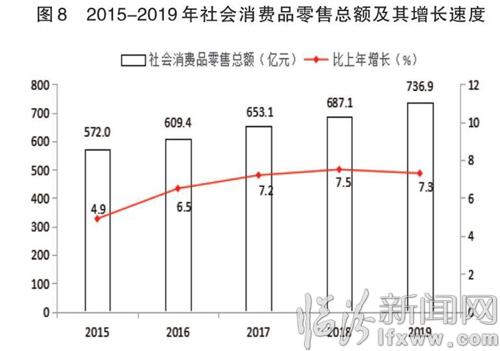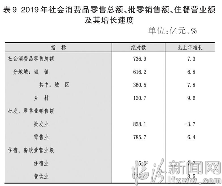 全年全市社会消费品零售总额736.9亿元,增长7.3%。按经营地统计,城镇消费品零售额616.2亿元,增长6.8%;乡村消费品零售额120.7亿元,增长9.6%。按消费形态统计,商品零售额672.3亿元,增长6.8%;餐饮收入额 64.6亿元,增长12.7%。