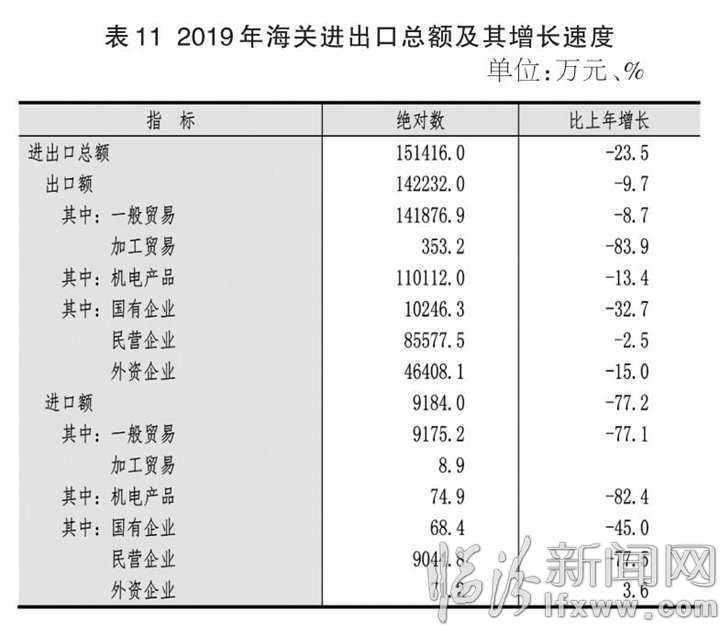 全年全市海关进出口总额15.1亿元,下降23.5%。其中,进口额0.9亿元,下降77.2%;出口额14.22亿元,下降9.7%。