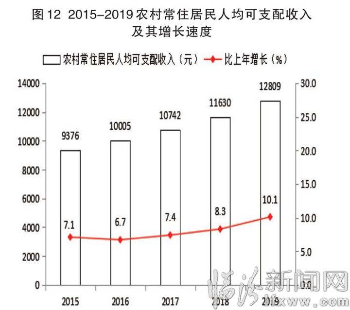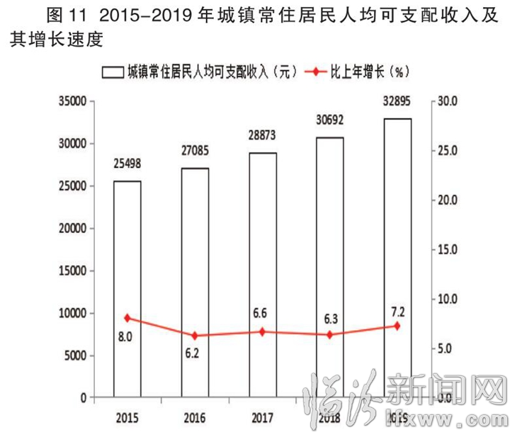 全年全市居民人均可支配收入22107元,比上年增长 9.5 %。其中,城镇常住居民人均可支配收入32895元,增长7.2%;农村常住居民人均可支配收入12809元,增长10.1%。居民人均消费性支出12572元,比上年增长7.5%。其中,城镇居民人均消费性支出16862 元,增长7.0%;农村居民人均生活消费支出9528元,增长7.5%。按全市居民五等份收入分组,城镇低收入组人均可支配收入15326元,增长8.7 %;农村低收入组人均可支配收入5129元,增长13.7 %。居民家庭恩格尔系数(即居民家庭食品消费支出占家庭消费支出的比重) 25.4 %。其中,城镇为24.3%,农村为26.8%。