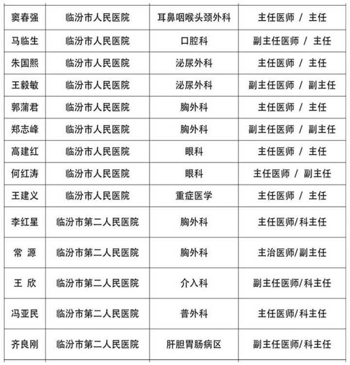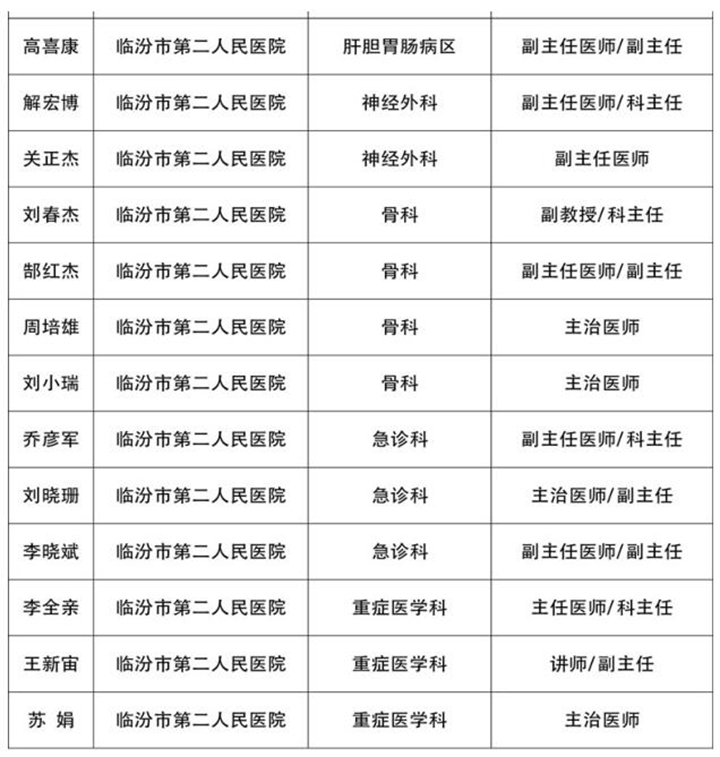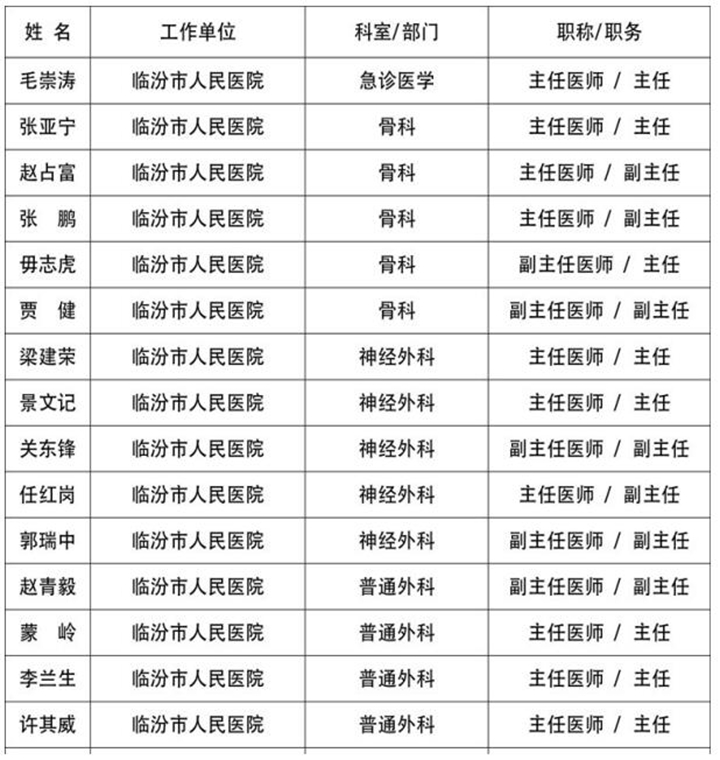 为充分发挥医疗专家在交通事故伤员应急救援救治中的作用,经“山西省道路交通事故重伤员无差别救助绿色通道医院”临汾市人民医院和临汾市第二人民医院推荐,临汾市道路交通事故社会救助基金管理联席会议办公室建立首批临汾市道路交通事故重伤救治医疗专家库,其中:主任医师21名,副主任医师18名,主治医师3名,总计42名专家。现公示如下: