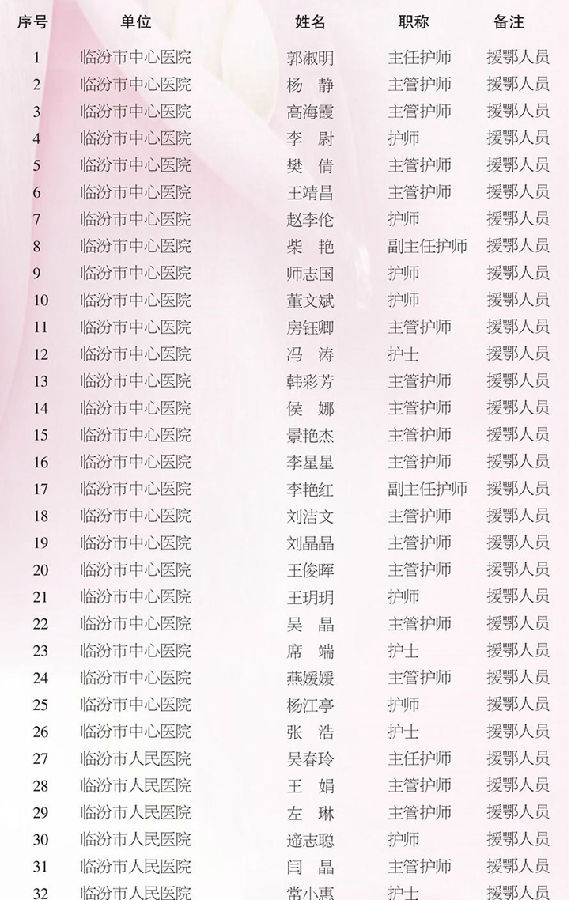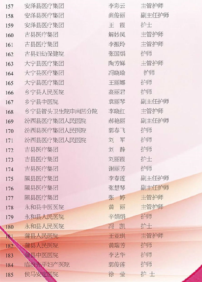 2020年5月12日是第109个国际护士节。世界卫生组织将2020年定为“国际护士和助产士年”。今年我国主题为“致敬护士队伍,携手战胜疫情”。新冠肺炎疫情发生以来,广大护士积极响应党中央号召,白衣执甲,逆行出征,冲锋在前,勇于担当,用实际行动践行了敬佑生命、救死扶伤、甘于奉献、大爱无疆的崇高职业精神。在打赢新冠肺炎疫情防控阻击战中作出了重大贡献,是“新时代最可爱的人”。为弘扬救死扶伤,无私奉献人道主义精神,营造尊重护士、爱护护士的良好社会氛围,市卫健委决定对郭淑明等185名优秀护理工作者进行表彰(其中:援鄂人员67名、临汾市第三人民医院隔离病区人员16名、其他护理人员102名)。