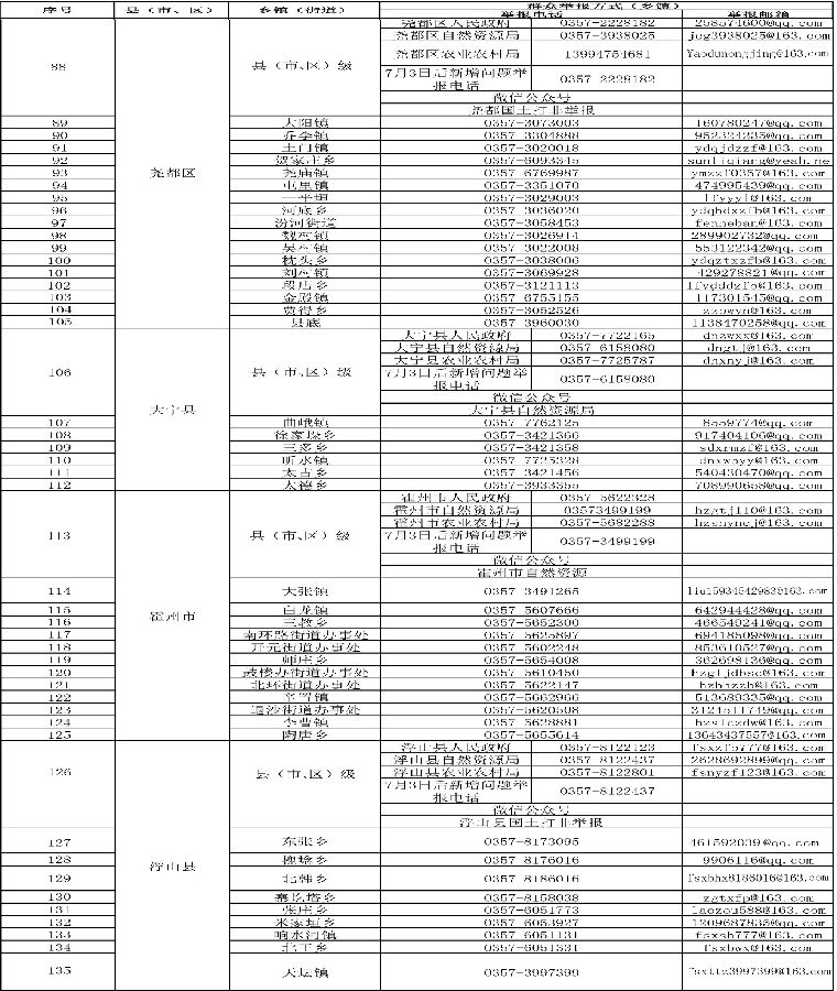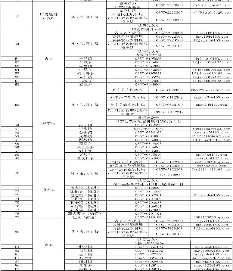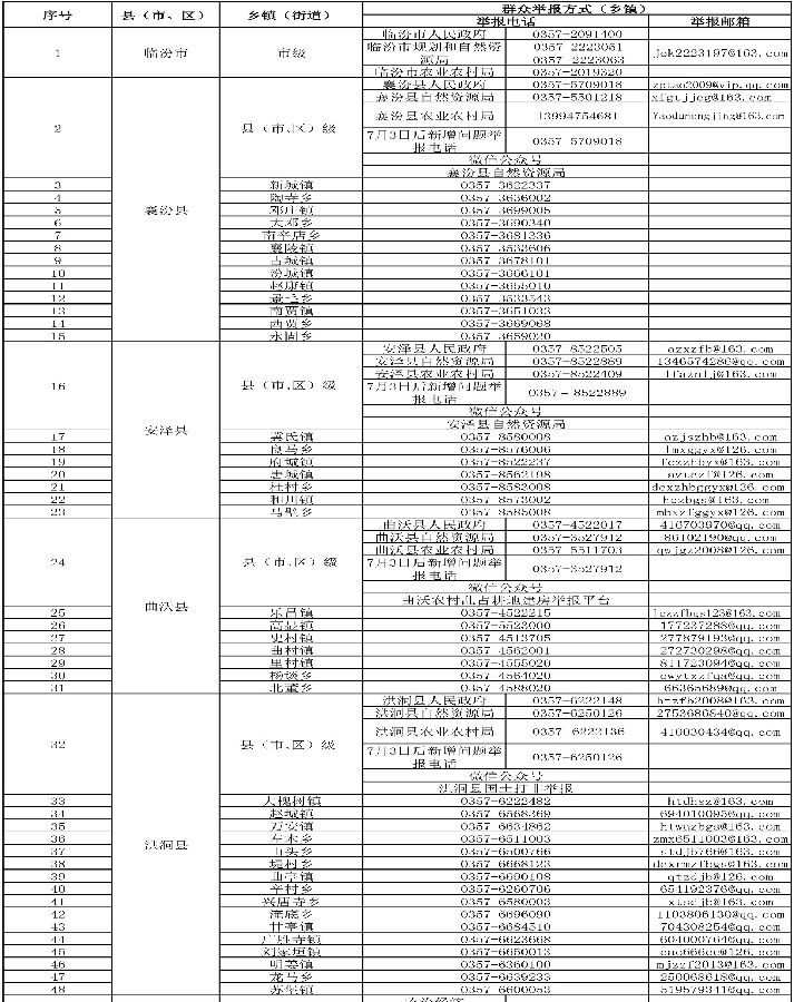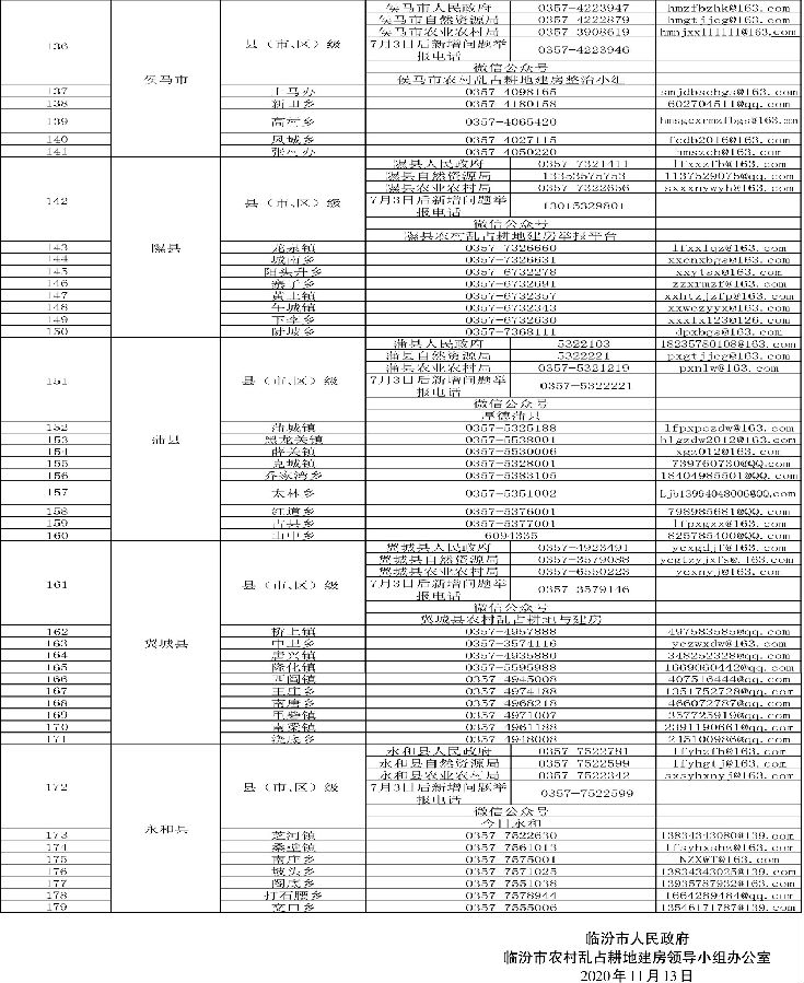 临汾市2020年7月3日后新增的农村乱占耕地建房问题专属举报电话,全市17个县(市、区)和1个开发区公众号、161个乡镇举报农房乱占耕地建房举报电话号码公示