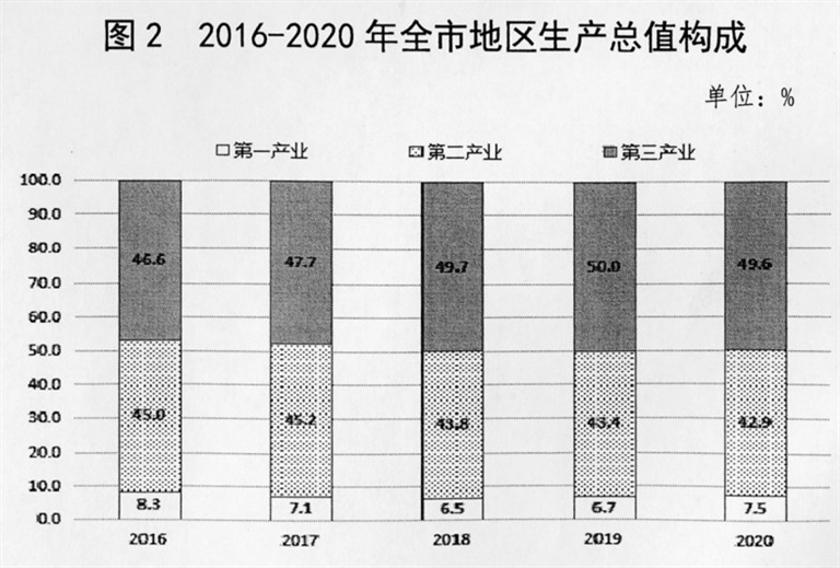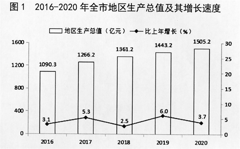 初步核算,全年全市地区生产总值1505.2亿元,按不变价格计算,比上年增长3.7%。其中,第一产业增加值113.4亿元,增长4.0%,占生产总值的比重为7.5%;第二产业增加值645.6亿元,增长6.2%,占生产总值的比重为42.9%;第三产业增加值746.2亿元,增长1.7%,占生产总值的比重为49.6%。