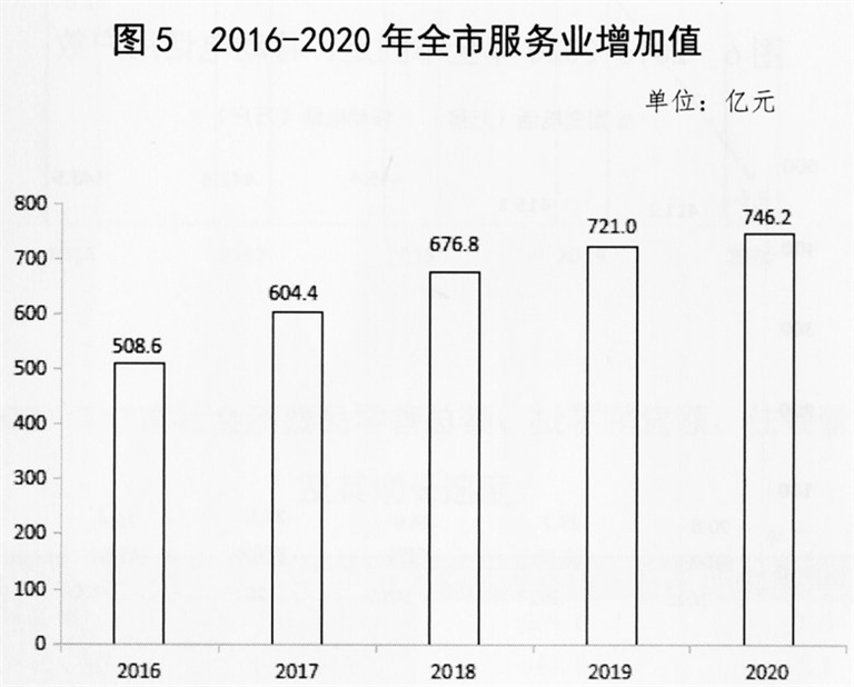 全年全市服务业增加值746.2亿元,按不变价格计算,比上年增长1.7%。其中,批发和零售业增加值109.4亿元,增长1.7%;交通运输、仓储和邮政业增加值88.9亿元,增长2.4%;住宿和餐饮业增加值14.5亿元,下降13.4%;金融业增加值79.7亿元,增长3.6%;房地产业增加值110.2亿元,增长3.3%;全年规模以上服务业企业营业收入比上年下降3.0%。
