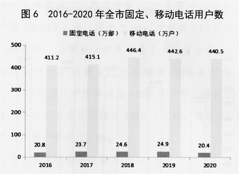 全年全市完成邮电业务总量312.4亿元,增长32.0%。其中,邮政业务总量4.8亿元,增长9.1%;电信业务总量307.5亿元,增长32.4%。年末全市固定电话20.4万部,减少4.5万部,下降18.1%;移动电话年末达到440.5万户,其中:4G移动电话用户达到375.0万户,下降2.6%,5G移动电话用户达到64.9万户。移动电话普及率97.7部/百人。年末全市宽带接入用户122.9万户,增长11.0%。