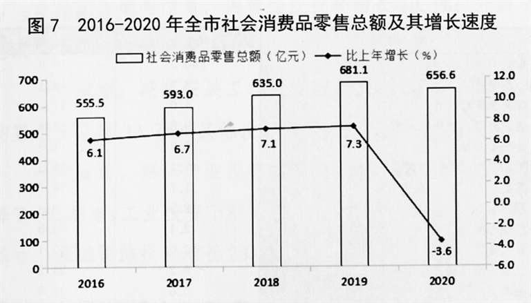 全年全市社会消费品零售总额656.6亿元,下降3.6%。按经营地统计,城镇消费品零售额544.1亿元,下降4.1%;乡村消费品零售额112.4亿元,下降1.3%。按消费形态统计,商品零售额601.1亿元,下降3.4%;餐饮收入额55.5亿元,下降6.2%。