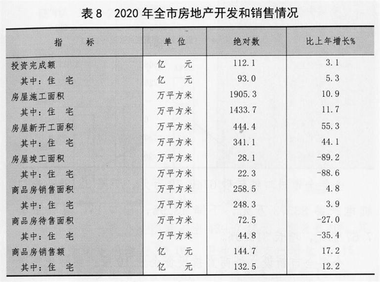 全年全市房地产开发投资112.1亿元,增长3.1%。其中,住宅投资93.0亿元,增长5.3%;商业营业用房投资10.4亿元,下降11.2%。