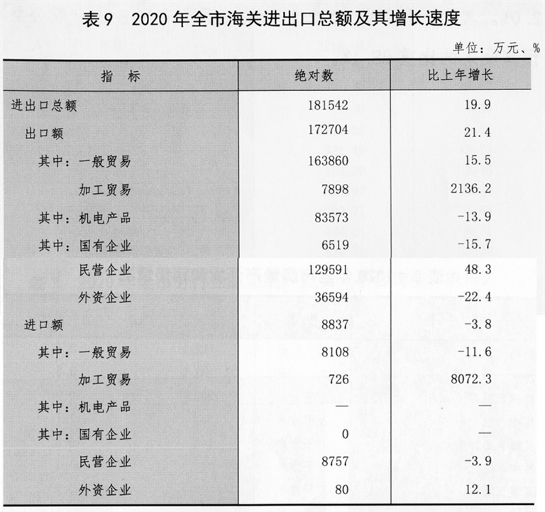 全年全市海关进出口总额18.15亿元,增长19.9%。其中,进口额0.88亿元,下降3.8%;出口额17.27亿元,增长21.4%。