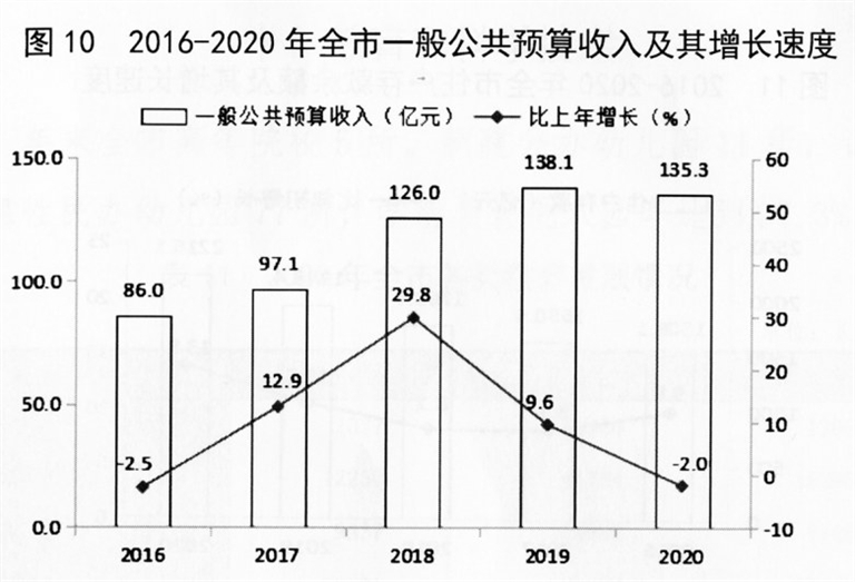 全年全市一般公共预算收入135.3亿元,比上年下降2.0%。其中,税收收入92.2亿元,下降7.9%,占一般公共预算收入的比重68.1%。