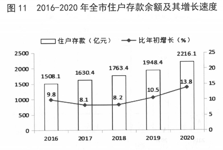 年末住户存款2216.1亿元,比年初增长13.8%。