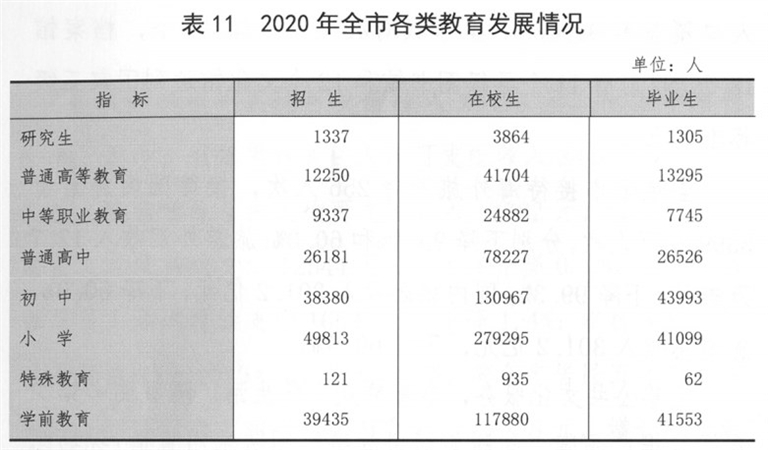 年末全市高等院校5所。新建公办幼儿园11所,认定普惠性民办幼儿园77所,学前教育毛入园率达到97.3%。