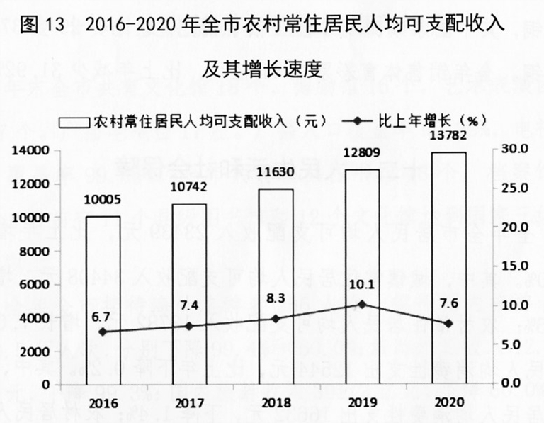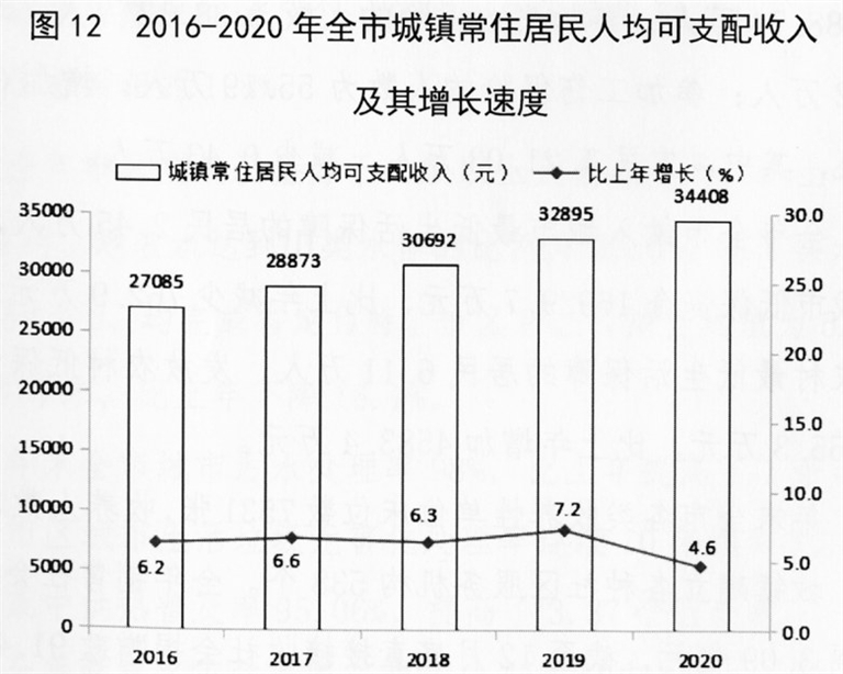 全年全市居民人均可支配收入23439元,比上年增长6.0%。其中,城镇常住居民人均可支配收入34408元,增长4.6%;农村常住居民人均可支配收入13782元,增长7.6%。居民人均消费性支出12544元,比上年下降0.2%。其中,城镇居民人均消费性支出16632元,下降1.4%;农村居民人均生活消费支出10104元,增长6.0%。按全市居民五等份收入分组,城镇低收入组人均可支配收入16288元,增长6.3%;农村低收入组人均可支配收入5662元,增长10.4%。