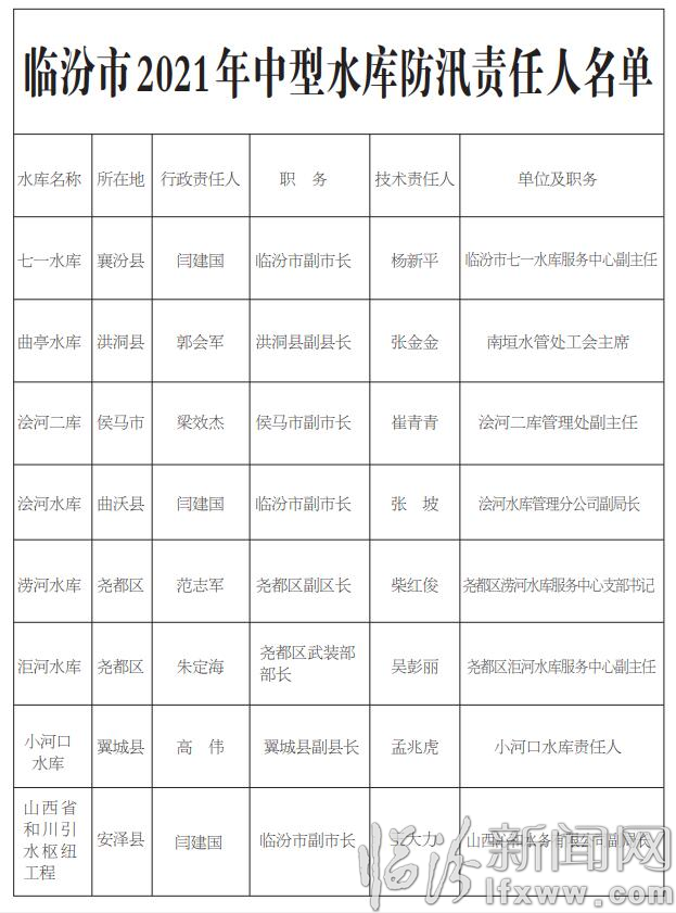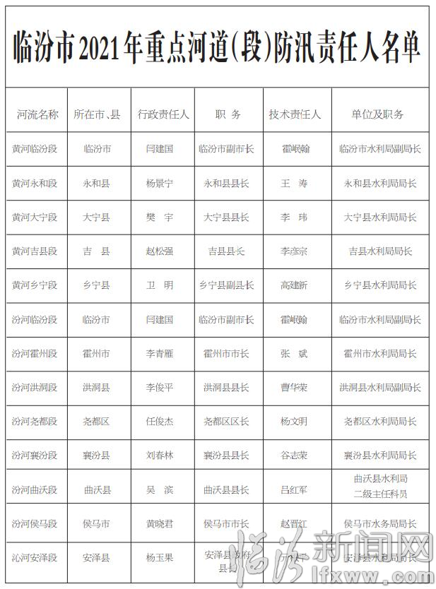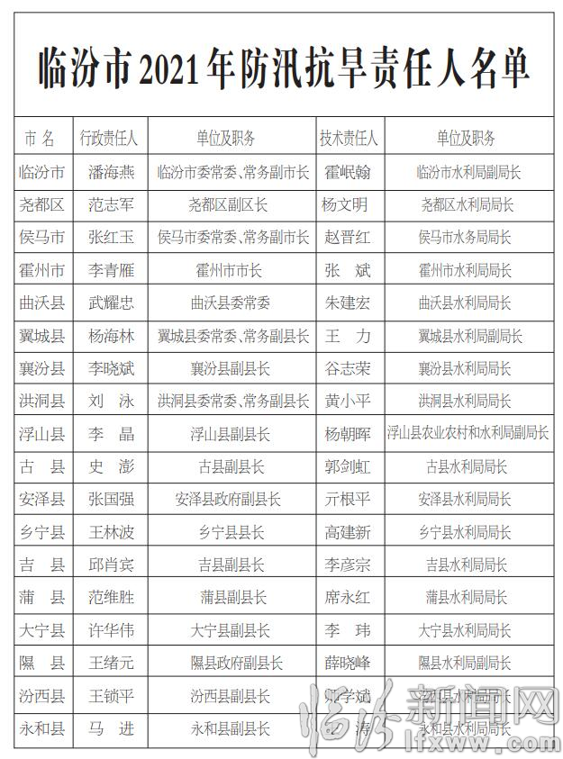 根据《中华人民共和国防洪法》、《中华人民共和国抗旱条例》和国家防总关于《各级地方人民政府行政首长防汛抗旱工作职责》的规定,结合我市实际情况,为全面做好2021年防汛抗旱工作,确保安全度汛,现将市、县两级防汛抗旱责任人、全市中型水库、重点河道(段)、重点防洪城市和县城防汛责任人予以公示。凡公示的责任人有变动,其职务的继任者在未重新公布责任人名单前即为防汛抗旱责任人。