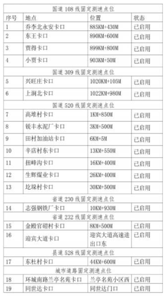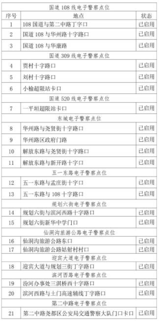 为进一步提升交通技术监控管理水平,加强道路交通安全管理,规范交通秩序,预防道路交通事故的发生,创造安全、文明、有序的道路交通环境,严厉打击超速、闯红灯、不按规定车道行驶、闯禁令、逆行等各类交通违法行为,根据《中华人民共和国道路安全法》、《中华人民共和国道路交通安全法实施条例》、新实施的《中华人民共和国行政处罚法》以及公安部《道路交通安全违法行为处理程序规定》等法律、法规的有关规定,依据山西省公路局临汾分局勘察设计院出具《临汾境内国省干线公路限速标志整改工程》标准。现将尧都区境内固定执法取证设备点位集中重新公示如下: