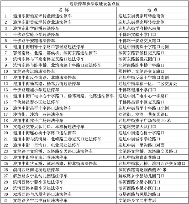 为进一步加强城区机动车停放管理,改善城市道路交通面貌,提升城市通行质量,预防和减少道路交通事故发生,根据《中华人民共和国道路交通安全法》、《中华人民共和国道路交通安全法实施条例》、《山西省实施<中华人民共和国道路交通安全法>办法》以及《道路交通安全违法行为处理程序规定》等法律法规的有关规定,依据《乡宁县靓城提质“三大行动”实施意见》要求,结合国家卫生县城、省级文明城创建工作,乡宁县公安局交通警察大队将在城区主要路段设置违法停车自动抓拍设备,规范停车秩序,打击违法停车行为,全力营造良好的道路交通环境,确保城区道路交通秩序畅通有序。现将新增道路交通违法停车执法取证设备点位公告如下: