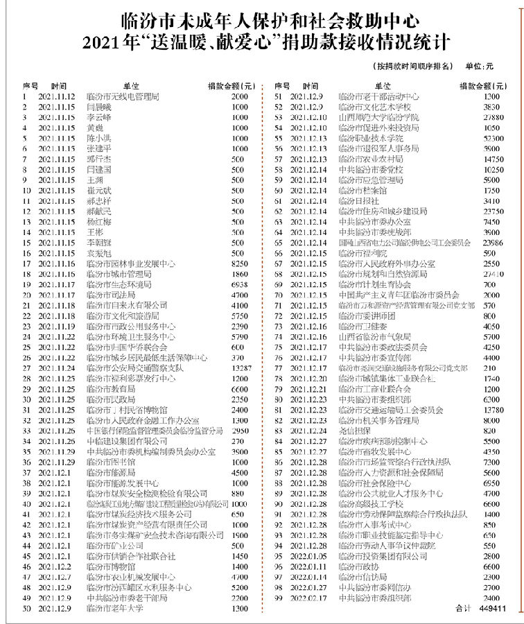 2021年11月12日,市委、市政府在全市开展“送温暖、献爱心”社会捐助活动,市直各单位积极响应,踊跃捐款,截至2022年2月17日,共收到捐助款449411元。捐助款由市民政部门根据困难群众生产生活实际情况,对基层组织和单位提出的申请,认真审查,统筹安排,及时拨付,2022年1月1日至2022年9月9日共下拨到53个村239000元,剩余款项将继续用于困难群众救助,确保将有限的捐款发放到困难群众手中,现将“送温暖、献爱心”捐助款接收和使用情况予以公示,欢迎社会各界监督。