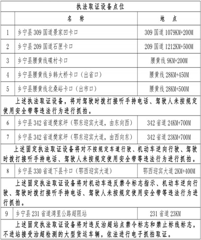 为进一步提升我县道路交通安全管理能力,预防道路交通事故,创造安全、文明、有序的道路交通环境,根据《中华人民共和国道路安全法》、《中华人民共和国道路交通安全法实施条例》、新实施的《中华人民共和国行政处罚法》以及公安部《道路交通安全违法行为处理程序规定》等法律、法规的有关规定,现将新增固定执法取证设备名称及地点进行公示: