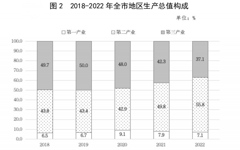 初步核算,全年全市地区生产总值2227.9亿元,按不变价格计算,比上年增长5.2%。其中,第一产业增加值158.0亿元,比上年增长5.2%,占生产总值的比重为7.1%;第二产业增加值1243.0亿元,增长7.0%,占生产总值的比重为55.8%;第三产业增加值826.8亿元,增长3.4%,占生产总值的比重为37.1%。