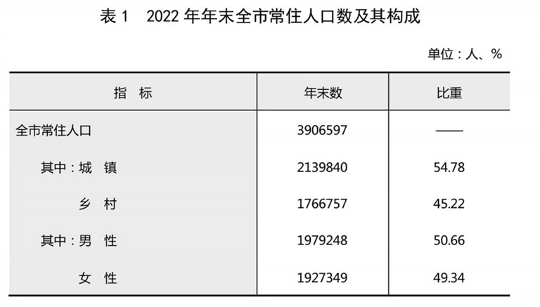 年末全市常住人口390.66万人,比上年末减少0.58万人。其中,城镇常住人口213.98万人,占常住人口比重为54.78%,比上年末提高0.63个百分点。全年全市出生人口2.48万人,出生率为6.35‰;死亡人口3.14万人,死亡率为8.02‰;自然增长率为-1.67‰。