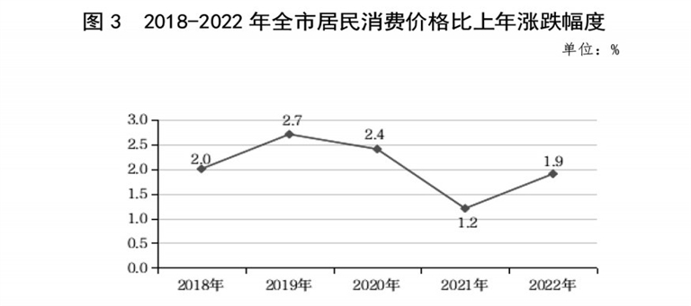 全市居民消费价格比上年上涨1.9%,其中,食品烟酒类价格上涨2.1%。
