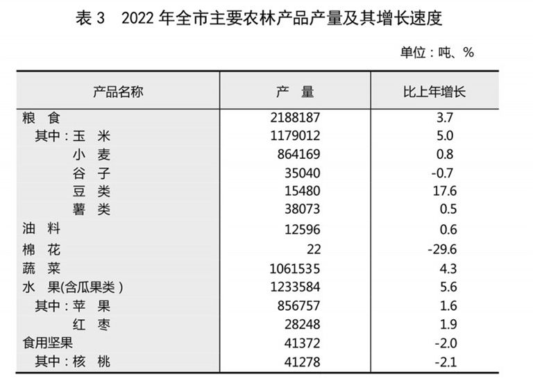 全年全市农作物种植面积546.58千公顷,比上年增加4.52千公顷,增长0.8%。其中,粮食种植面积504.49千公顷,增加3.32千公顷;油料种植面积6.12千公顷,减少0.19千公顷;蔬菜种植面积20.50千公顷,增加0.95千公顷。在粮食种植面积中,玉米种植面积255.72千公顷,增加0.03千公顷;小麦种植面积200.41千公顷,减少0.70千公顷。果园种植面积63.46千公顷,增加2.82千公顷。