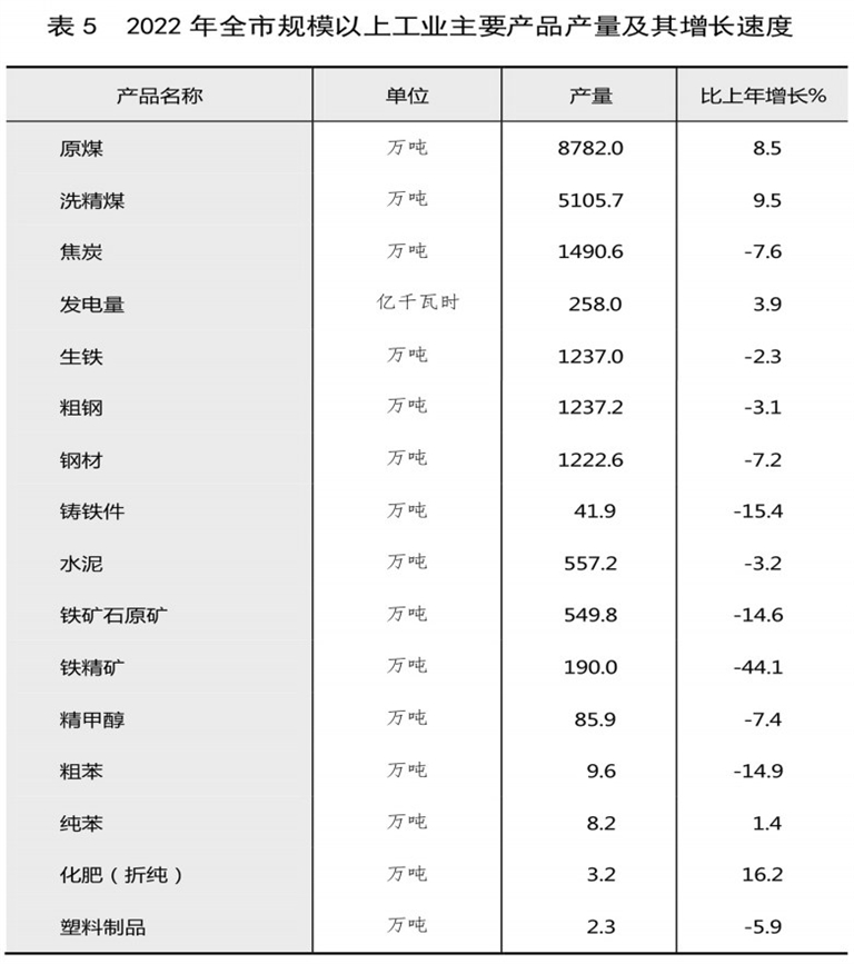 全年全市规模以上原煤产量8782.0万吨,比上年增长8.5%;焦炭产量1490.6万吨,下降7.6%;发电量258.0亿千瓦时,增长3.9%;非常规天然气产量18.5亿立方米,下降1.0%。