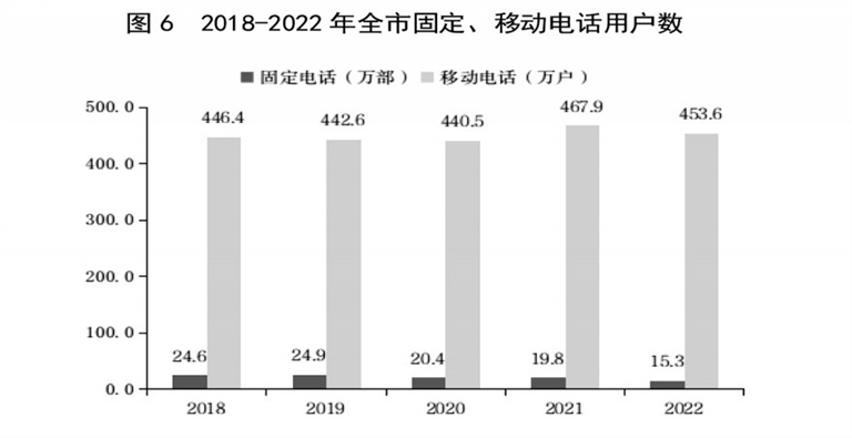 全年全市完成邮电业务总量42.4亿元,比上年下降2.8%,其中,邮政业务总量4.5亿元,增长2.6%;电信业务总量37.9亿元,下降3.4%。年末全市固定电话15.3万部,比上年下降22.7%,移动电话453.6万户,下降3.1%,移动电话普及率115.9部/百人。年末4G基站总数16243个,比上年增长0.9%;5G基站总数6533个,增长99.5%。全市宽带接入用户155.1万户,比上年增长10.8%。